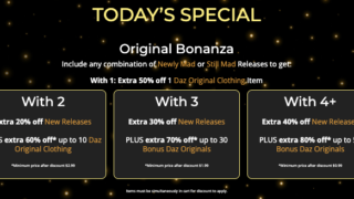 今日は新製品を4つ抱き合わせで、Daz Originalの洋服が表示価格の約1/10になるという狂気のセールです。