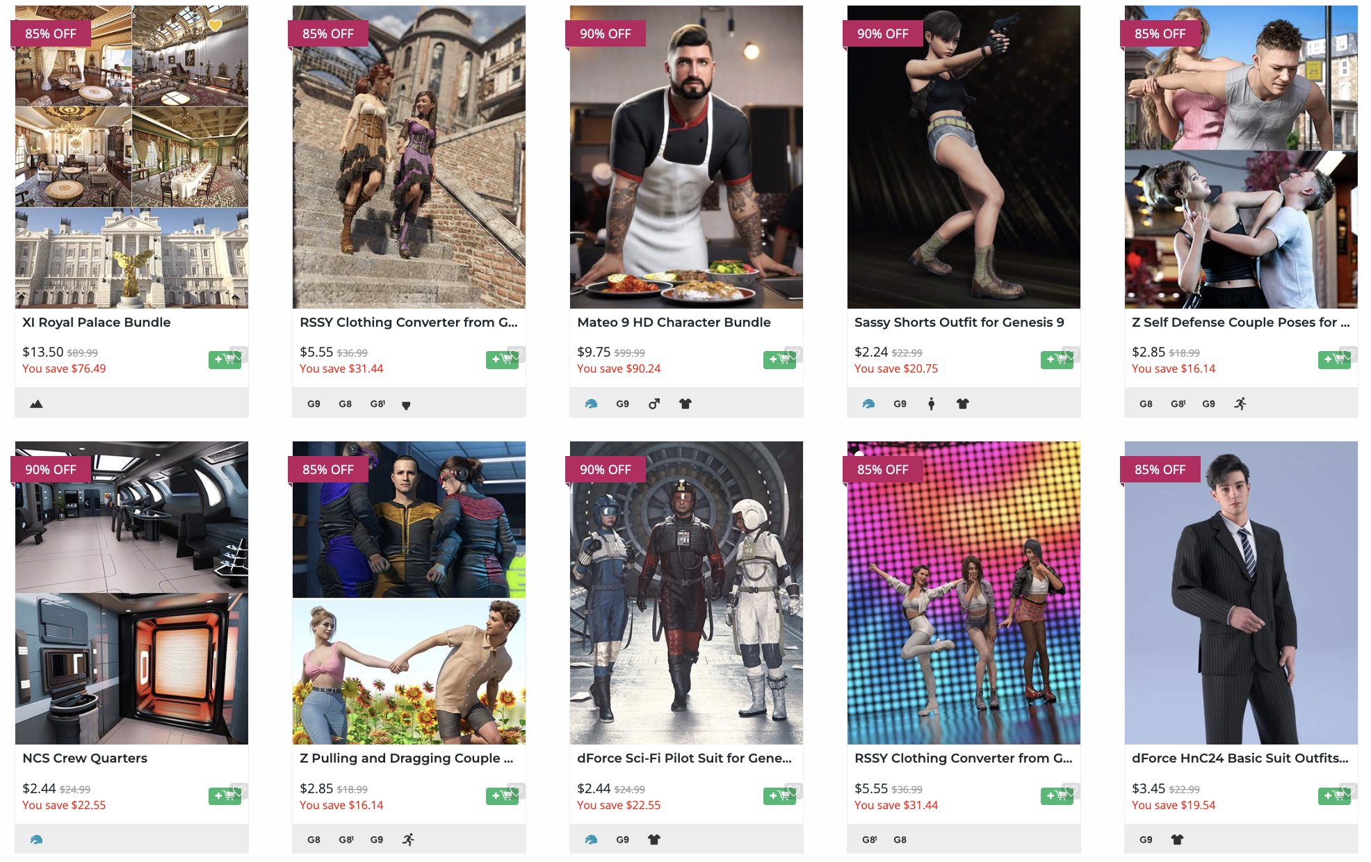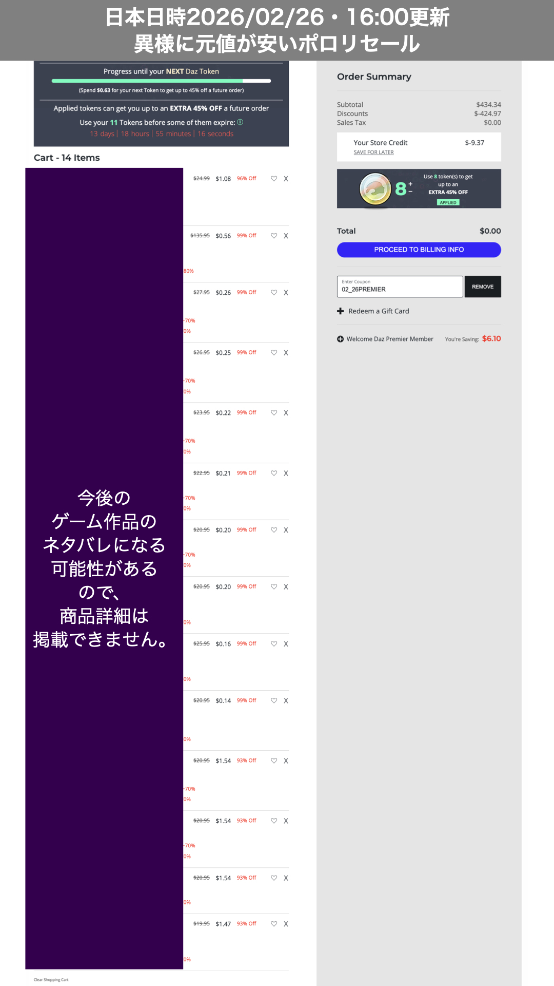 リスト通りの価格になるか?急いで全69個のアイテムをカートに通してみますが、結局、計算通りになった14個のアイテムを急いで決済しました。ついでにDazOriginalの10$OFFクーポンが使えたので、定価434.34$の合計14個のアイテムを9.37$の97.84%OFFで購入することはできました。
