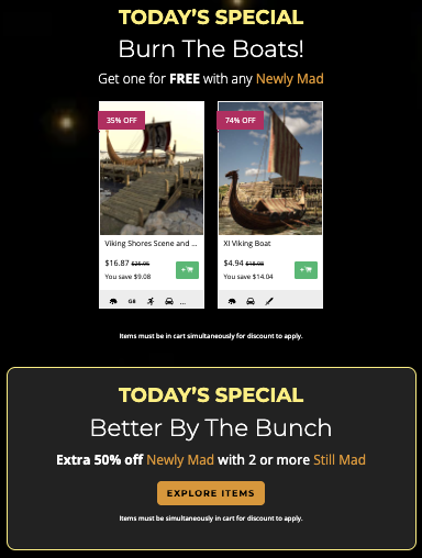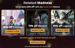「 Mad Artist Stores 」も同じく、日替わりで対象となる商品が微妙に少しづつ変わっています。$1.07(5トークン)で購入できるアイテムが、Mad Artist Storesから消える可能性もあります。