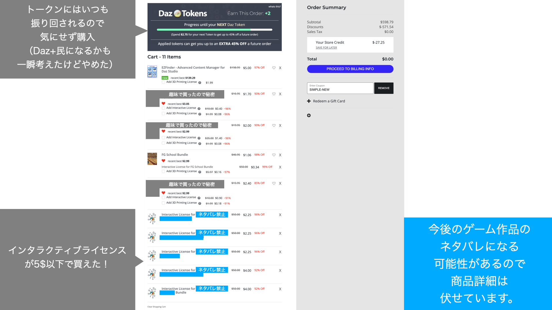これはDazShopが意図しているかは分かりませんが、絶対にゲームで使用したアイテムのインタラクティブライセンスが過去最大で安くなっていたので即ポチりました。