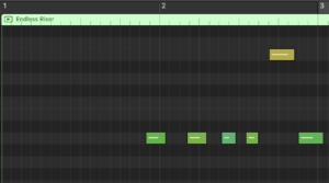最終的に演奏した音楽は、横に流れる棒上のノートと呼ばれるタイムラインに表示される音の有無で表現されます。ということは、手入力でノートを入力すれば難しい演奏を練習しなくても、マウスでポチポチすれば曲が作れるのでは?という発想に至ります。
