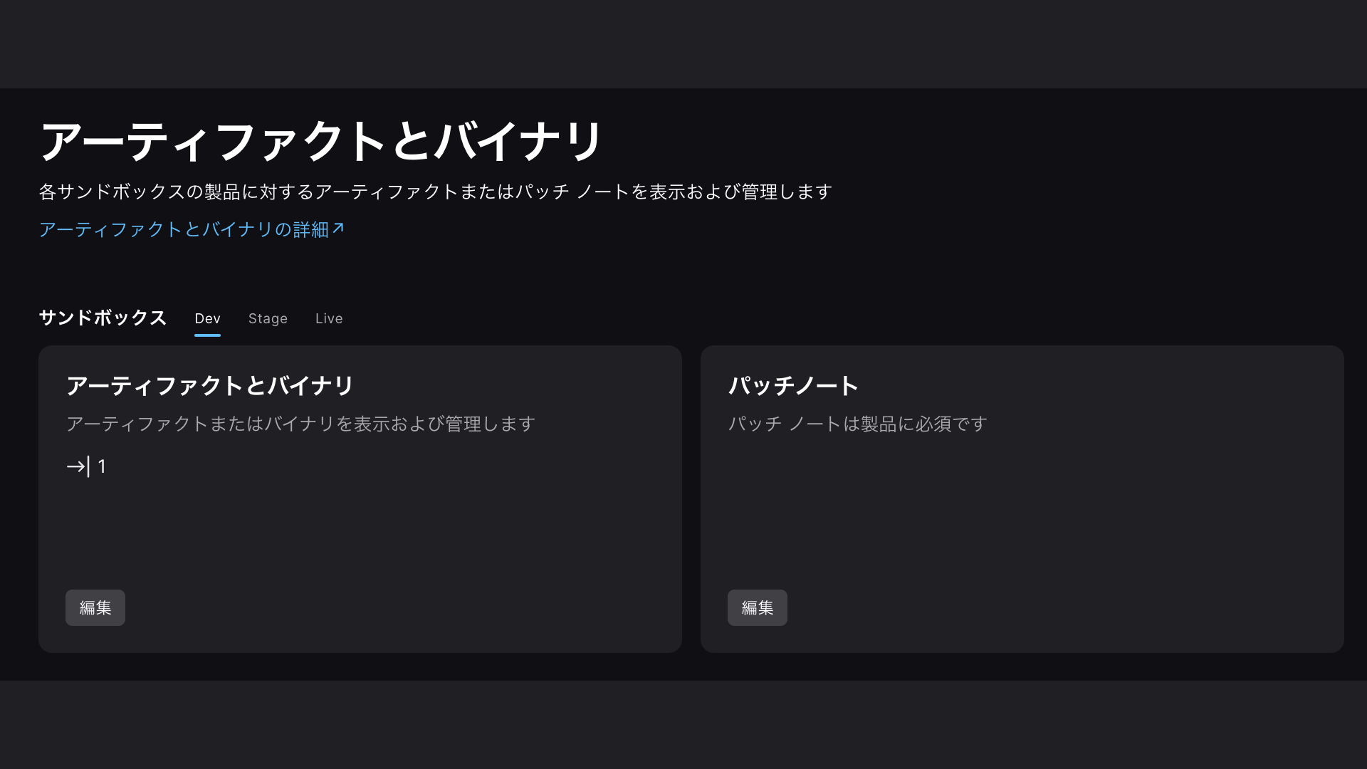 - 製品編集ページから、アーティファクトとバイナリを選択します。