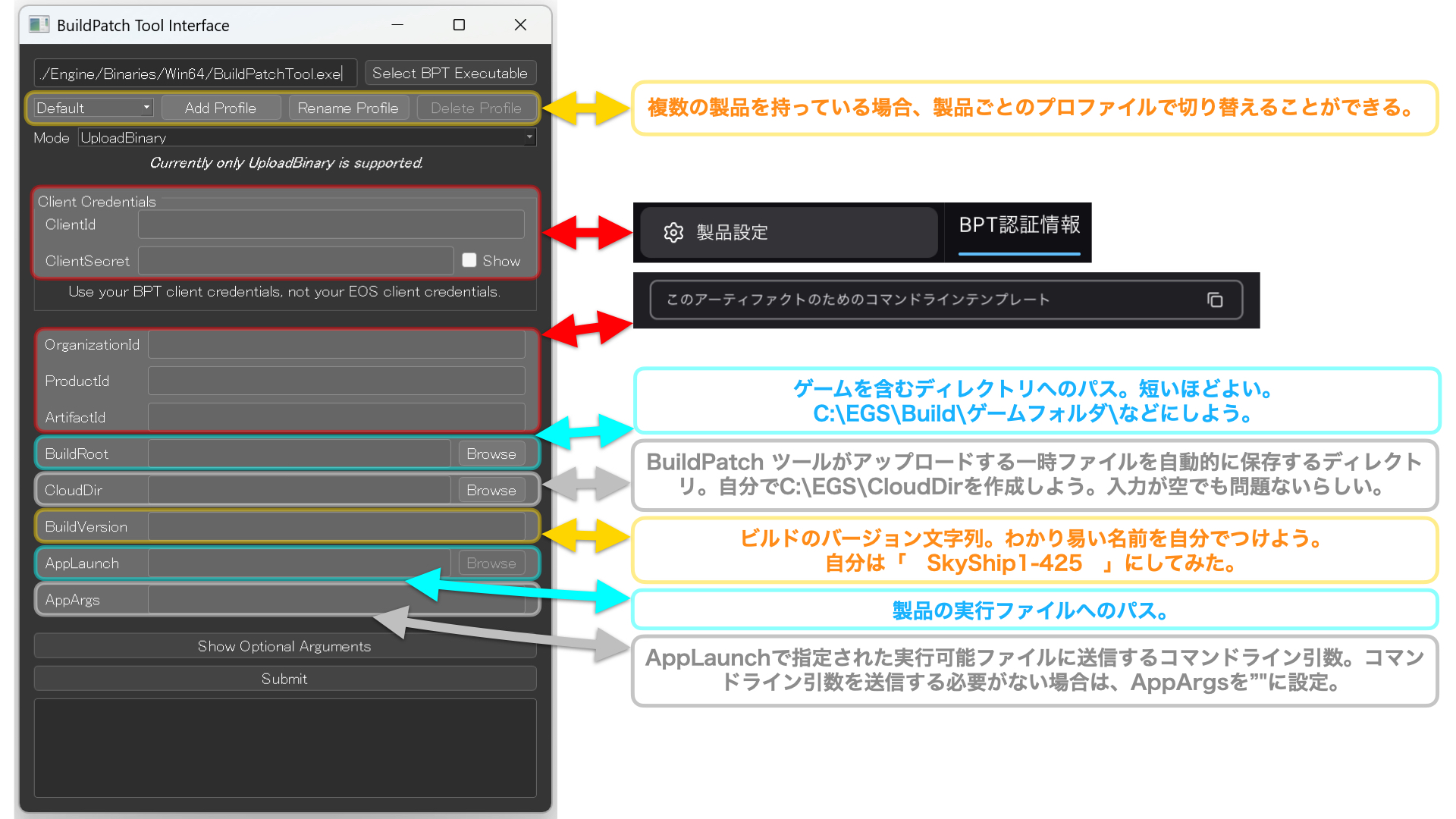 (Buildpatch Tool Interfaceの引数をプロファイルに保存し、後でそのプロファイルを読み込んで引数を素早く設定することができます。これは、Epic Games Storeで複数の製品をお持ちの場合に便利です。製品ごとにプロファイルを作成し、その製品のバイナリをアップロードする際に適切なプロファイルを読み込めば大丈夫です。) - ClientID:ClientSecret :製品設定 → BPT認証情報 → それぞれのEpicが作成したIDを取得することができます。