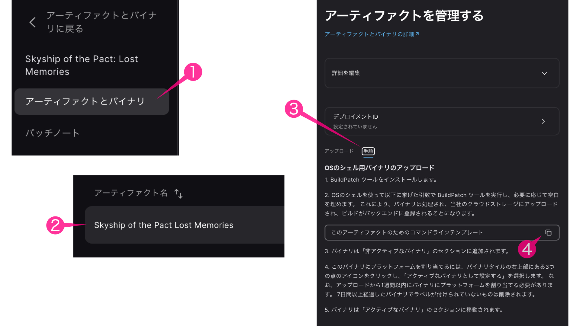 - 次の手順にBuildPatch ツールの引数としてIDを入力していきます。