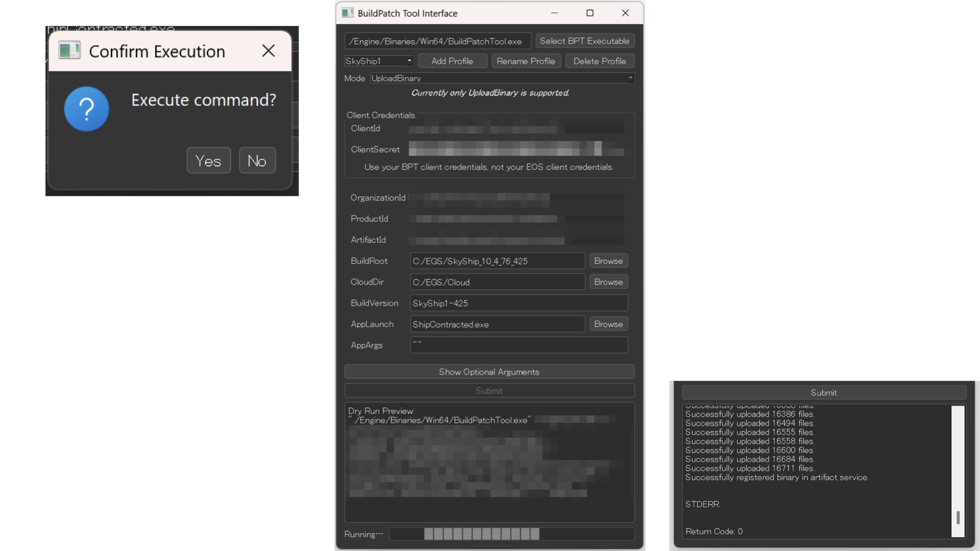 - Profile:You can save your Buildpatch Tool Interface arguments to a profile and load the profile later to quickly set those arguments. This is useful if you have multiple Epic Games Store products. You can set up a profile for each product, then load the appropriate profile when you want to upload binaries for that product.