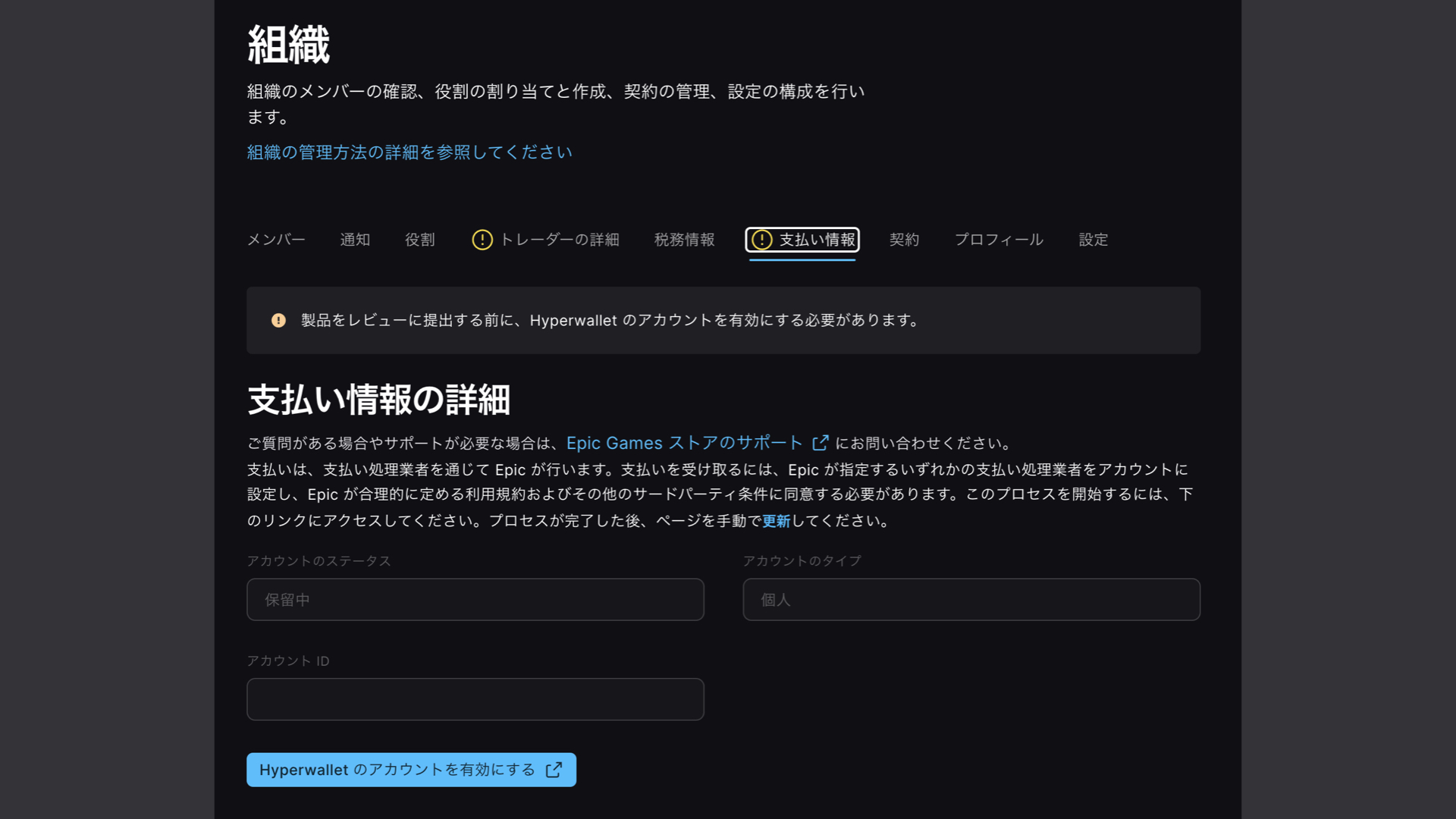 審査が終了すると ダッシュボード → 組織 → 支払い情報 → Hyperwalletのアカウントを有効にする という青色のボタンが出現します。そこからも結構手順が長いので時間をゆったりとれるときに作業しましょう。