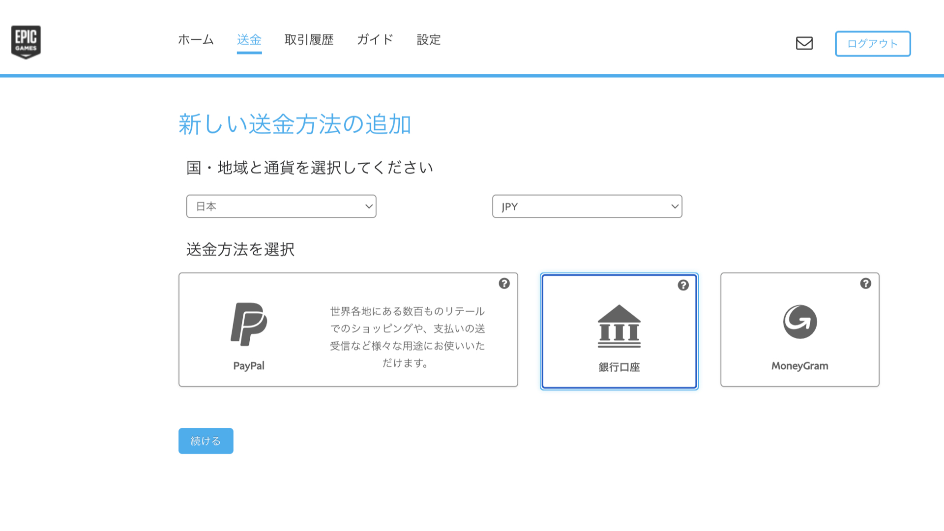 - PayPal、銀行口座、MoneyGramの3つから選択できます。自分は無難に銀行口座を指定しました。(ここもおそらくSteamと同様に海外と取引できるSWIFT電子送信による支払いができる必要がある可能性があります。※これは憶測です。もしかしたらSWIFTは必須では無いかもしれません。)