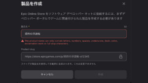 - 製品を作成というポップアップウインドウが出現 → 製品名を64文字までで入力するフォームに自分のゲームのタイトルを入力する。(日本語で入力するのかと思いきや、英語のみかつその他Epicが規定する記号「 spaces( ), underscore(_), dash(-), colon(:), exclamation mark(!), full stop(.) 」のみが使えるようです。)またここに入れた名前から商品のURLとなるスラッグが自動的に作成されるので、見やすいURLも意識して製品名を入力する必要があります。この作業だけで1時間半ほどかかりました。ChatGPTと相談して、「 契約の浮遊船 失った記憶と空の遺跡 」が「 Skyship of the Pact: Lost Memories 」というタイトルになりました。Steamでは「 Ship Contracted 」にしているので、同じ製品なのにSteamとEpicでタイトルが異なり厄介なことになってしまいました。