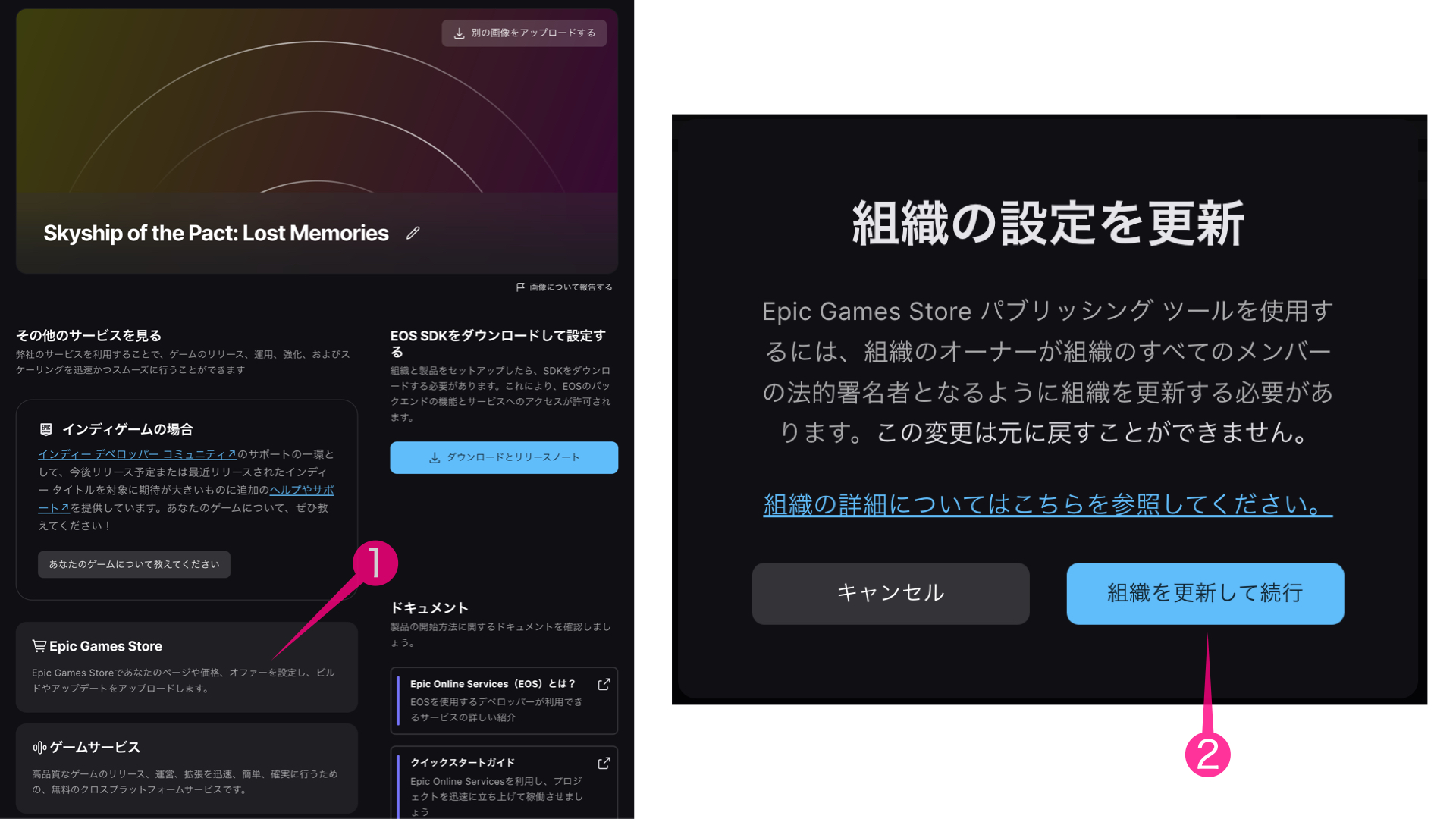 Epic Games Storeのドキュメントで、オンボーディング プロセス → B. 管理プロセスを完了する という部分におそらくポップアップウインドウでしなければならない組織の設定の詳細が記載されていました。書いている順番に進めていきましょう。