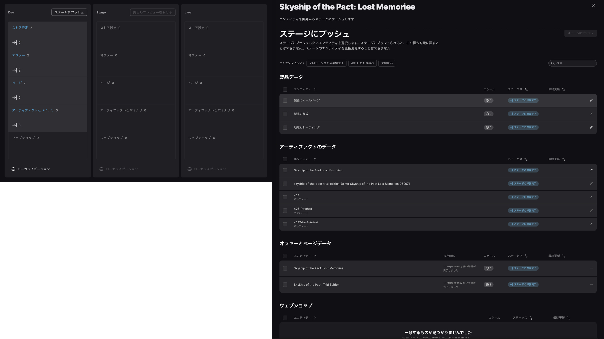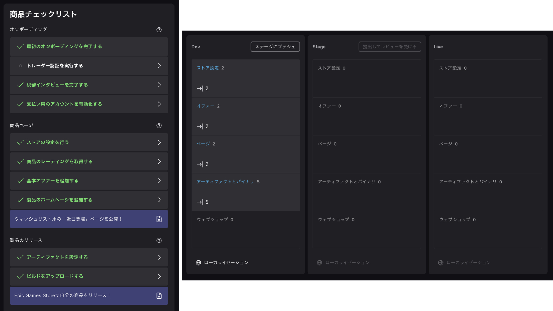 1. Epic Games Storeの開発者ダッシュボードから → 自分の製品 → Epic Games Store → 左のサイドバー「 リリース管理 」 → Dev横の「 ステージにプッシュ 」ボタンを押す。
