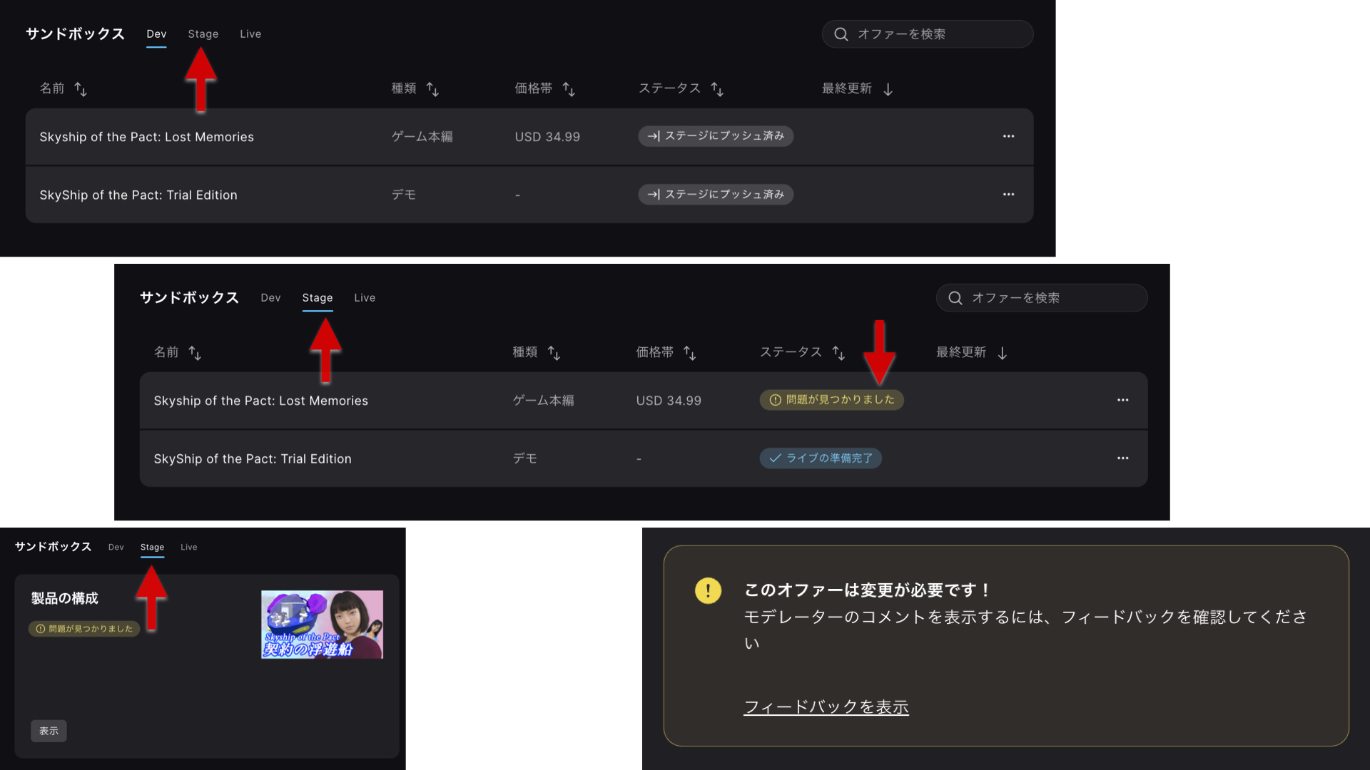 問題がある箇所の、サンドボックスの、Dev、Stage、Liveという小さなタブを選択することでそれぞれの段階での詳細が切り替えられます。審査が終了して問題があると、Stageのタブに変更することで問題の詳細ページへアクセスすることができます。