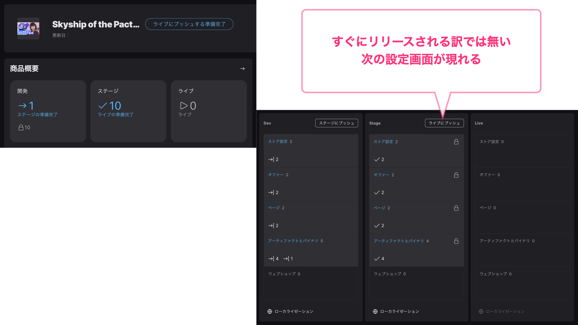ライブにプッシュの最終画面では上の図のようなライブにプッシュという画面が出てきます。その下に各要素(アーティファクトとバイナリ、ストア設定、地域とレーティング、製品のホームページ)「 製品版ストアページ、デモ版ストアページ、デモ版リリース、製品版リリース 」がどのように公開されていくかのスケジュールラインが表示されます。これは審査までに製品の日付を具体的で設定したときの日付が表示されます。