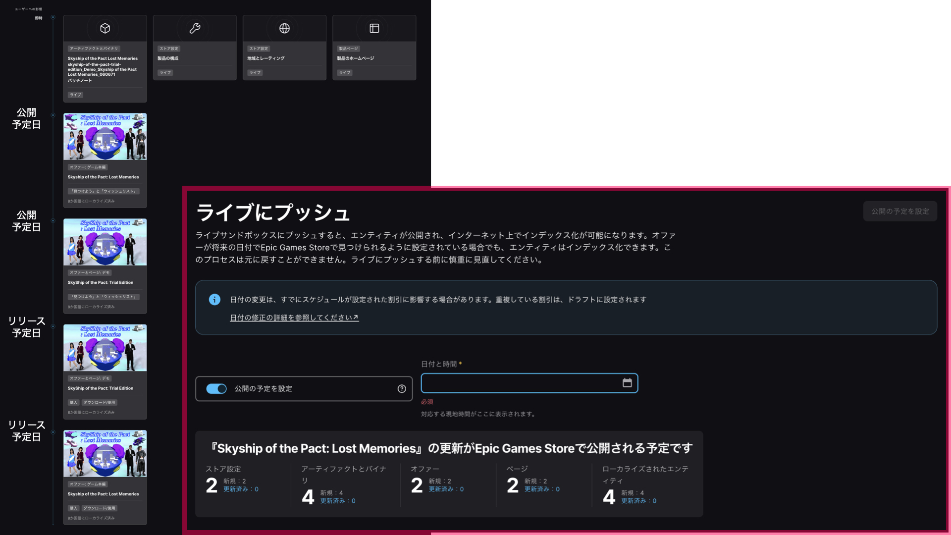 ライブにプッシュのページで、公開の予定を設定するトグルボタンがあります。自分はこれで各要素(アーティファクトとバイナリ、ストア設定、地域とレーティング、製品のホームページ)「 製品版ストアページ、デモ版ストアページ、デモ版リリース、製品版リリース 」に対して公開する日付を設定できるものだと思っていたのですが、どうやら違うようでした。