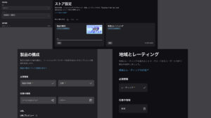 価格では基本の価格を選択(もしくは入力?)した後に地域ごとの価格を決定できます。Steamのときと同じで、為替のレートが以上に低い国などで極端に低価格になることは避けておきましょう。もしくはその地域では配信できない(しない)ように設定しましょう。