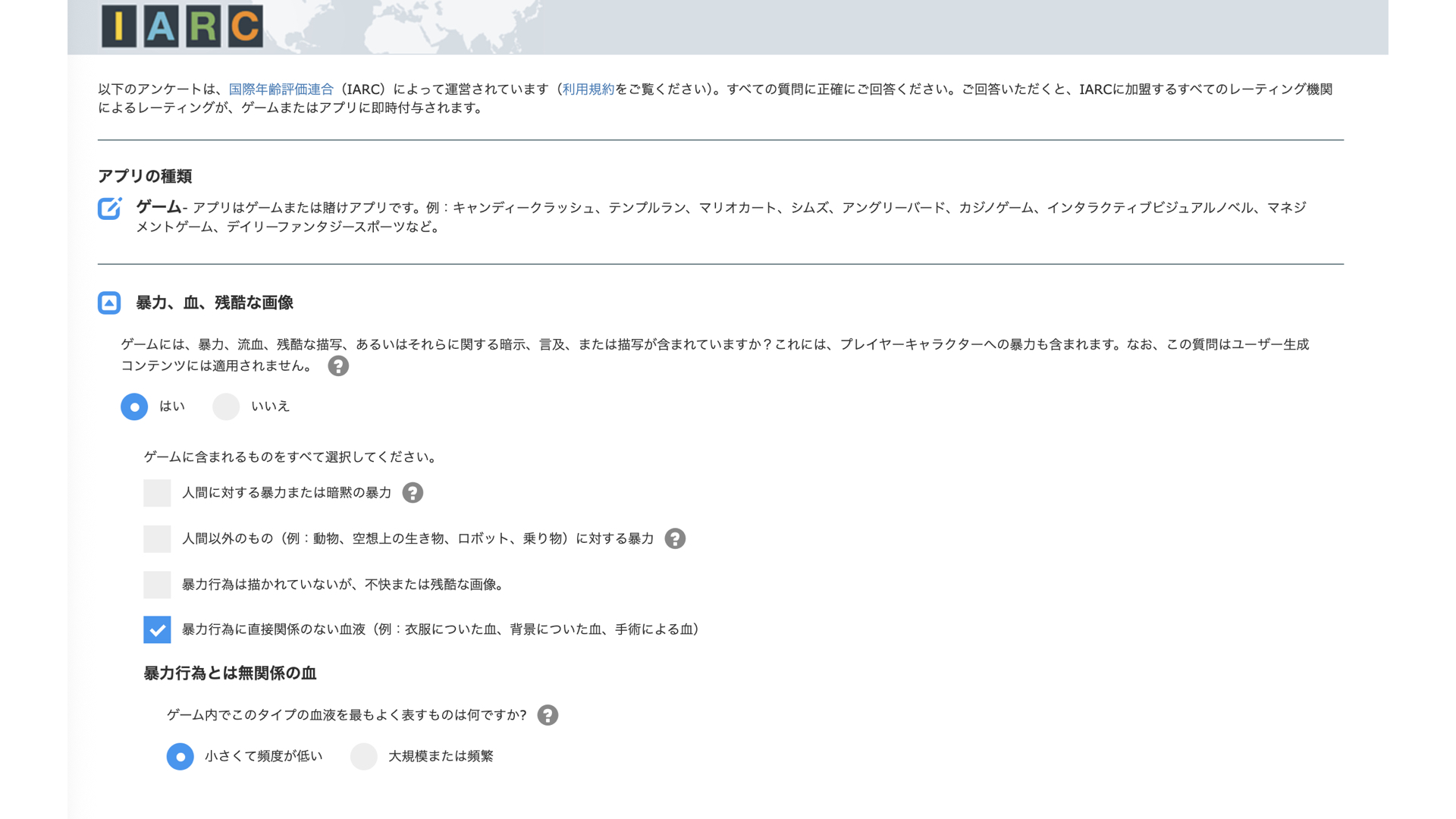 IARCという期間が定めるゲーム内容のレーティングを質問形式で進めていきます。自分のゲームの内容と照らし合わせて質問に答えていきましょう。