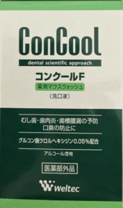「 コンクールf 」といううがい薬のようなものもあります。これは歯磨きの後や、寝起きにうがいをして口の中を殺菌してくれる消毒液のようなモノです。希釈して使うので小さいコップが必要です。自分は「 マウスウォッシュ 」のキャップの蓋だけ大切に残してそれを使ってコンクールfを希釈しています。
