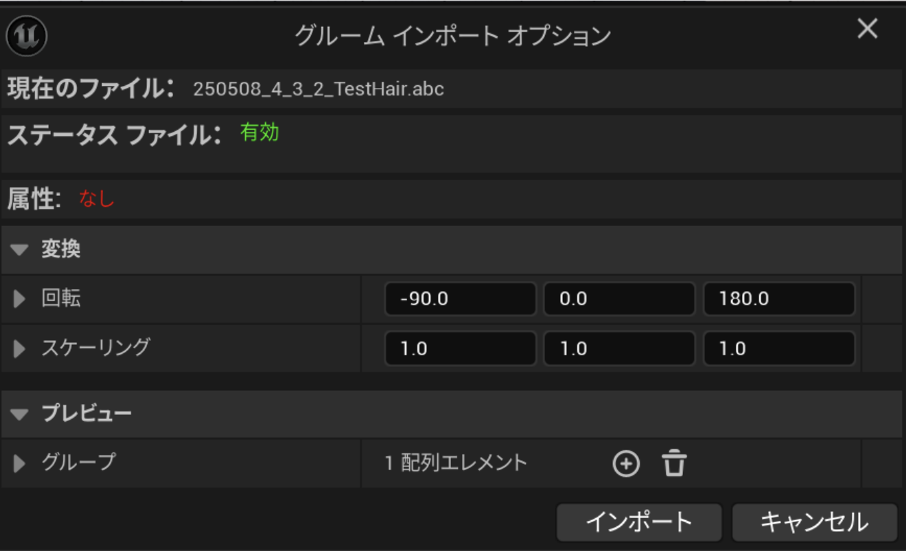 - コンテントドローワー → Import To/Game/HairTutorial(保存先でここの名前は変わる) → GroomImportOptionが表示されると成功 → RotatinXを-90 Zを180 → Import → Groomアセットとしてインポートされる